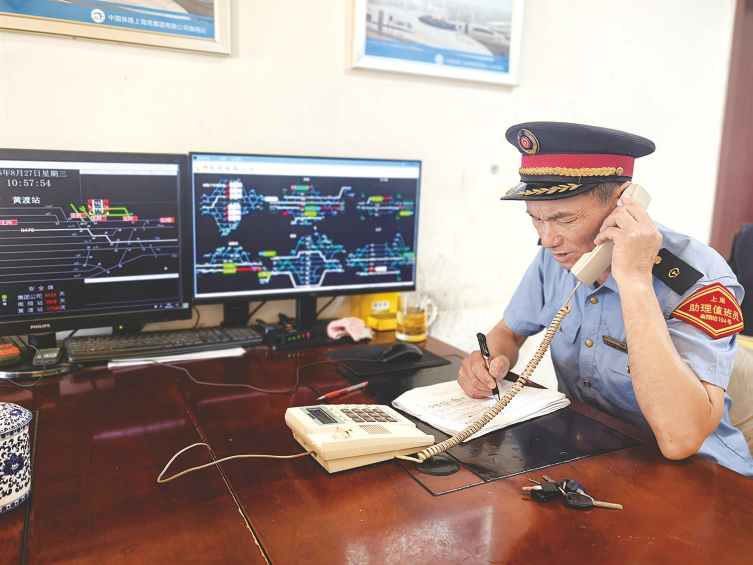 “X338次二道接车”,指令刚落,黄渡站外勤助理值班员蒋祖伟便快步走向接车位立岗。“眼看、手指、口呼”“三个面向”,每一个接发列车制度要求的动作,他都做得一丝不苟——这样的流程,他已重复了整整38年。