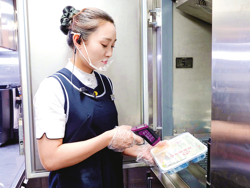 在自营的“华东印记”主题餐厅,店长丁诗孟详细介绍了食材验收规范流程:每天要通过闻气味、观色泽、触质地等方式细致检查食材质量,同时对照货单依次复秤。厨师长徐长青在烹饪环节严格把关:“所有热链餐出锅中心温度必须≥70℃,并定时记录。”