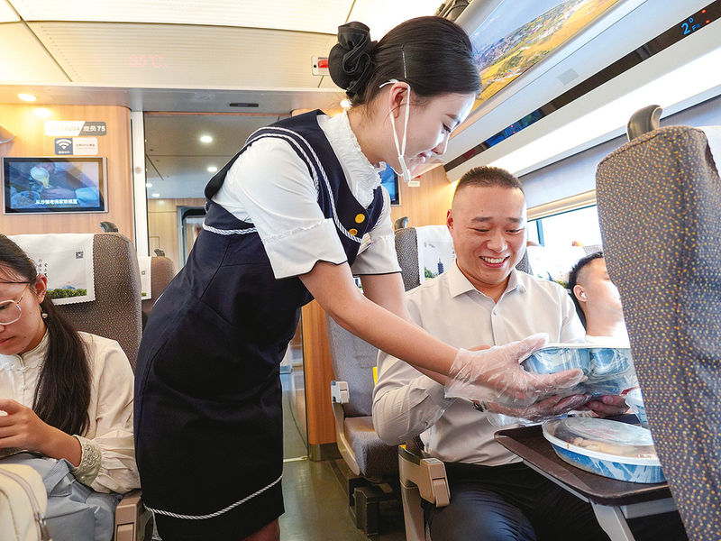 午餐时分,在飞驰的G8次列车上,旅客王先生通过扫描座椅扶手二维码购买的“白灼虾牛肉谷物餐”快速送到了他手中。品尝完美味的餐食后,王先生对菜品的味道赞不绝口:“这份轻食餐搭配合理,吃起来也很爽口。”华铁旅服公司通过丰富餐食品类、严控食品安全、创新服务等举措,全面提升高铁餐饮服务品质。