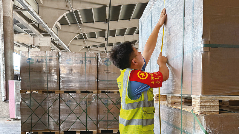 货运员测量光伏产品尺寸,为制定装载方案做准备。 (通讯员汤征嵘摄) 通讯员 廉一鸣
