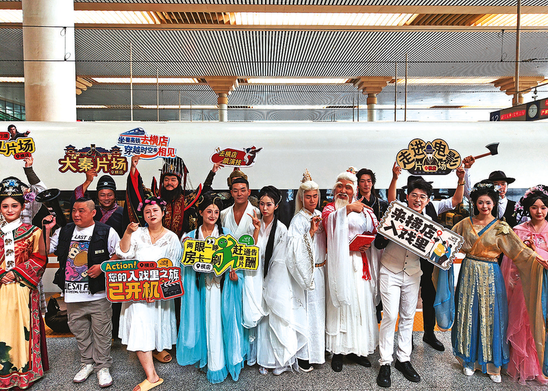 列车启程前,南京南站候车大厅变身“影视片场”。30余名影视角色演员开展趣味巡游互动,重现多部经典影视剧中角色,引发旅客纷纷拍照、即兴“对戏”,现场气氛热烈。列车行驶途中,八节车厢分别打造为八大影视主题场景,涵盖《功夫》《甄嬛传》《白月梵星》等多部热门剧集经典片段,乘客通过与角色演员互动、完成剧情任务、收集线索等方式,体验“跨剧联动”和“片场闯关”乐趣。列车抵达横店站后,游客按不同客群,分别体验定制化的影视主题线路。参与者不仅可观看演出、与演员同台表演,还可参与微电影拍摄,亲历剧组开机、影视妆造、趣味表演、杀青等全流程,深度感受影视制作的神奇魅力。