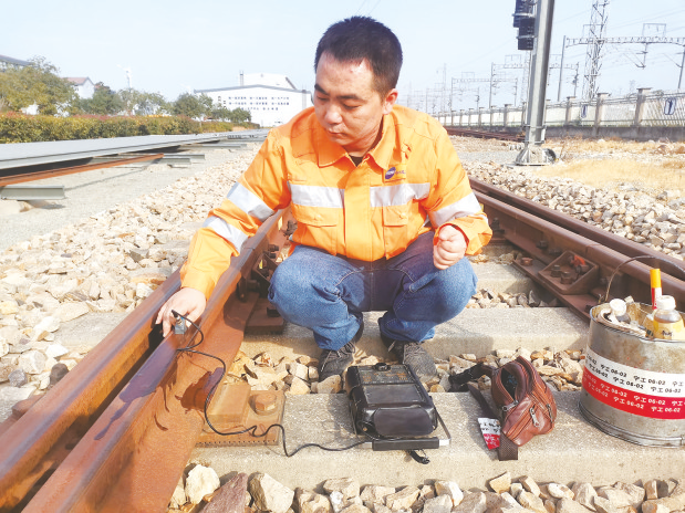进入宁波工务段探伤车间大院,步行在长约50米的“星光大道”上,展示车间探伤技能人才的15块荣誉牌矗立在道路旁,柯鑫辉的荣誉牌位列首位。眼里有活、心中有责,勤于动脑、善于思考,坚守探伤工岗位16年,柯鑫辉在毫厘之间打磨匠心,用高超的钢轨探伤技术,守护着铁路运输安全。