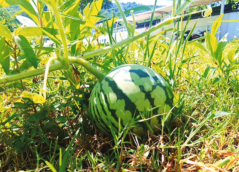 最初,出苗的时候,嫩绿的西瓜苗,两片深绿的叶子,如手指头一样大,夹在两片叶子中间,是小小的芽,连接着茎。夜里,在灯光的照射下,嫩绿的茎如翡翠透亮。天气热,我们担心西瓜被晒死,就给西瓜苗搭了一个棚子,没想到第二天就下起了大雨。后来,西瓜苗长大的时候,还经历过毁苗危机,工区草坪的草长长了,绿油油一片。下班归来,我们发现长长的草都被打草机打掉了,于是匆忙跑到西瓜身旁,幸好它们被草盖住了!