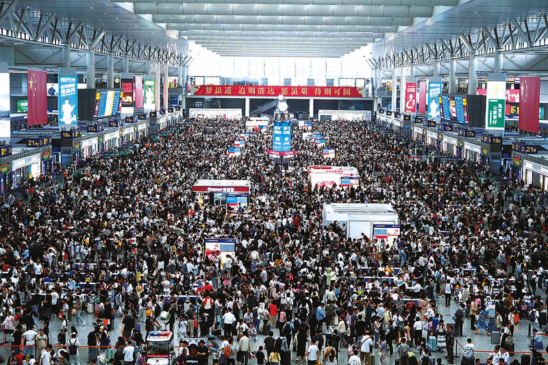 国庆中秋假期期间,集团公司加强旅客运输组织,强化路地联动和安全保障,落实便民利民服务举措,努力保障旅客平安有序温馨出行。图为10月1日,上海虹桥站迎来客流最高峰,当天上海直属站发送旅客81.2万人。