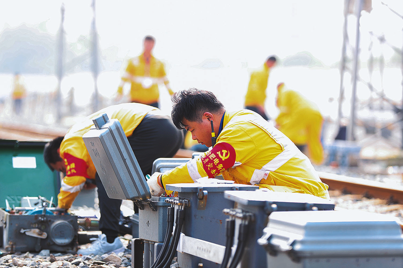 淮安高铁基础设施段作业人员进行轨道作业车分解连挂