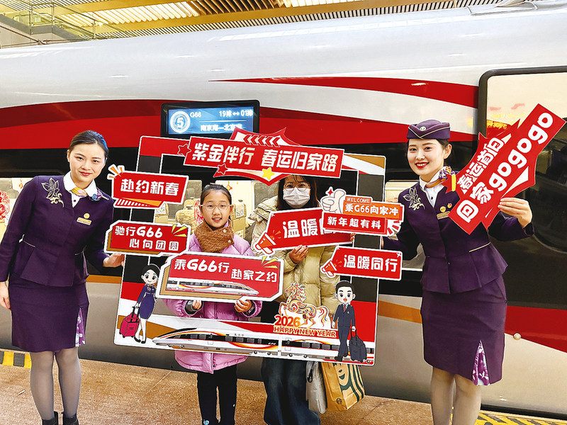图①:南京客运段在“紫金号”G66次列车上开展新春送福活动。图为列车工作人员和旅客在站台上合影留念。 (通讯员 浦铮 摄)