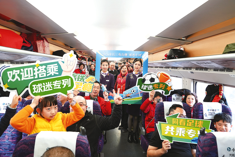图为在G7008次列车上球迷与列车工作人员合影。 (通讯员 李信宏 摄) 本报讯(记者 宋亚堃 通讯员 胡晓炜)3月1日10时,G7008次列车载着370余名上海海港足球队球迷从上海站驶出,前往目的地江苏南京观看2026中国足协超级杯决赛,标志着长三角地区今年首趟“球迷专列”顺利开行。