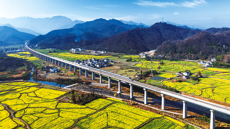 春到长三角,高铁沿线油菜花渐次开放,如同一道道流动的风景线。图为复兴号列车穿越池黄高铁黄山西至黄山北区间的油菜花海。