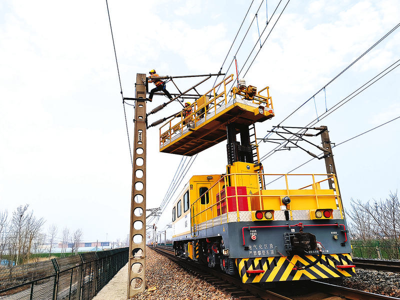 徐州供电段在陇海线第一阶段集中修中,优化作业方法,区间采用轨道车加两台车梯,站场采用三台车梯,对接触网设备开展全面检修。图为该段职工在轨道车进行检修作业。