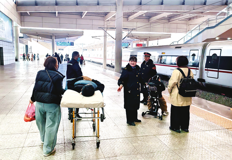 同一时间,候车室内,客运值班员杨剑正推着一辆儿童推车走向检票口。车上坐着一位可爱的小女孩,几个月前腿部摔伤,今天是去北京复查。小姑娘坐在车上晃着双脚,恢复情况良好,只是走路还需时日。“小朋友,去北京干什么呀?”杨剑蹲下身,视线与她齐平。“看医生,医生说看完我就能走路啦!”小姑娘声音清脆。杨剑笑着接过推车,与女孩妈妈闲聊起来。即将退休的她,在客运岗位上送走了无数趟列车,却始终热爱与孩子们相处,“每次看到小朋友,心情就特别好”。